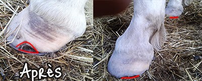Kalinka, c'était la même chose au début. Ca a pas mal pété, parce qu'après des années de ferrage, le pied était "déformé" (sans compter que le maréchal ne faisait pas un parage très adapté au pied nu, donc les pieds de Kalinka ne changeaient pas vraiment en bien). Maintenant que je fais intervenir une pareuse, le pied reprend une forme physiologique, son pied fonctionne à nouveau normalement, bye bye les grosses cassures et douleurs.